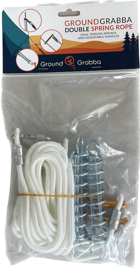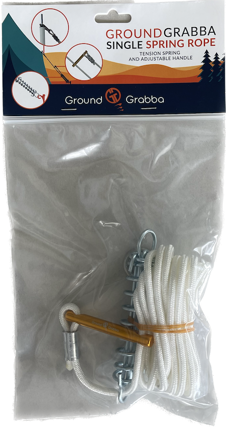 At one end of the rope is a carabiner for flexibility to attach to structures or tent poles and the opposing end has a spring/s that attach to your GroundGrabba's via a HexHook Pro or ClosedHook or via an optional carabiner.